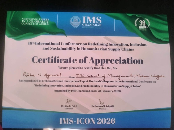 Dr. Richa N. Agarwal, Associate Professor at I.T.S School of Management, Ghaziabad, served as the Technical Session Chair for the technical session at the International Conference on “Redefining Innovation, Inclusion and Sustainability in Humanitarian Supply Chains”, on 27th February 2026, organized by IMS, Ghaziabad.