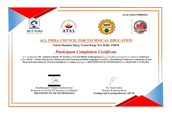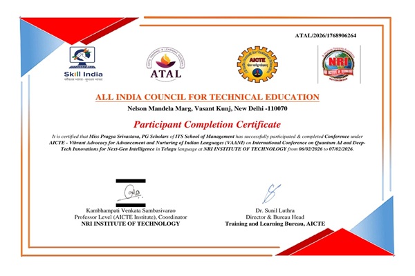 ITS School of Management, Mohan Nagar, Ghaziabad actively participated by sending students to represent the institution and contribute to the academic discourse in the two-day International Conference on Quantum AI and Deep-Tech Innovations at NRI Institute of Technology (NRIIT), Agiripalli, Vijayawada, Andhra Pradesh on 06th -07th February, 2026.