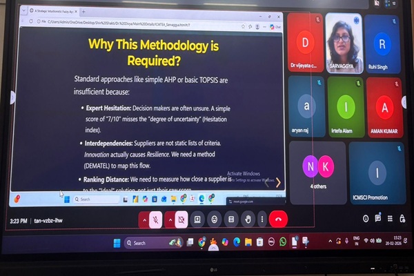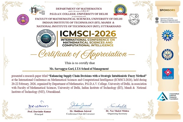 Sarvaggya Goel, a second-year PGDM student (Batch 2024–26) from I.T.S School of Management, presented a research paper titled “Enhancing Supply Chain Decisions with a Strategic Intuitionistic Fuzzy Method” in an International Conference on Mathematical Sciences and Computational Intelligence (ICMSCI-2026) held from February 20–22, 2026,