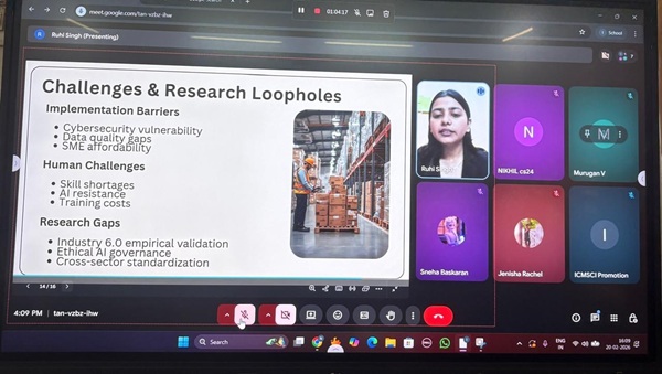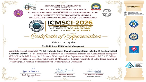 Ruhi Singh, a student of PGDM Batch 2025–2027 participated and presented a research abstract titled “AI Integration in Supply Chain Management from Industry 4.0 to Industry 6.0: A Critical Literature Review” in an International Conference on Mathematical Sciences and Computational Intelligence (ICMSCI-2026), organized by P.G.D.A.V. College, Nehru Nagar, New Delhi on 20 February 2026.